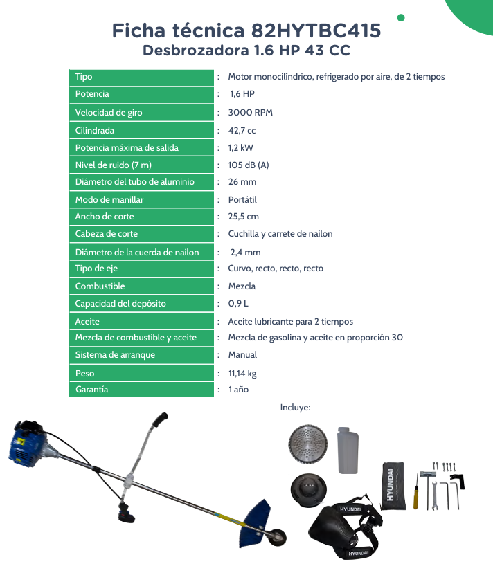 43cc Desbrozadora a combustión hyundai 43cc | 82hytbc415 $ 195.000 Precio con transferencia: $ 185.250 Agregar al carro Avísame cuando llegue